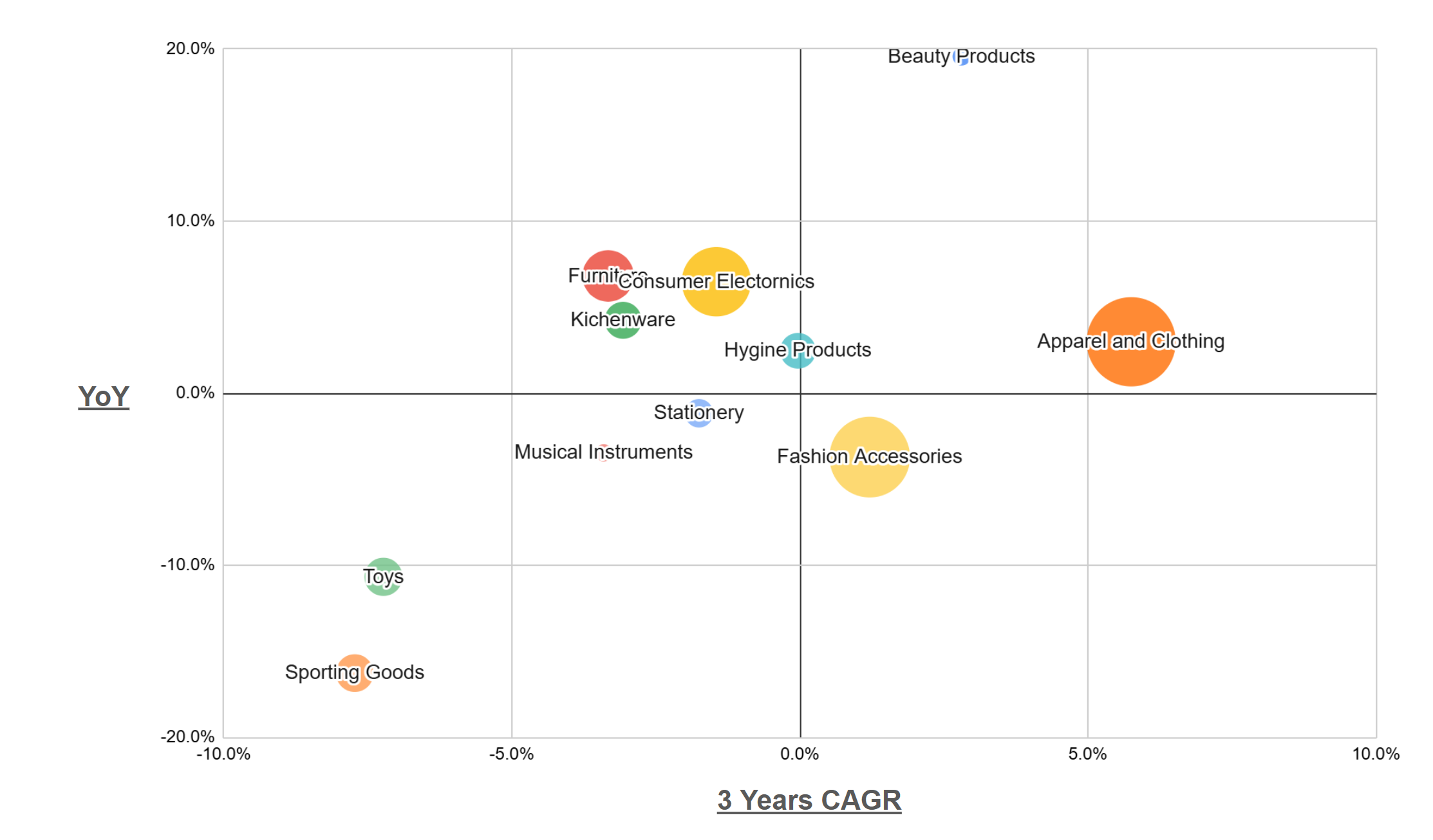 Here at Deep Dive Korea, we’ve been tracking import trends across 11 different sectors and 107 consumer goods categories. The graph below breaks down the growth trajectory for each area, showing the 3-year average growth rate on the X-axis and the year-over-year growth on the Y-axis.