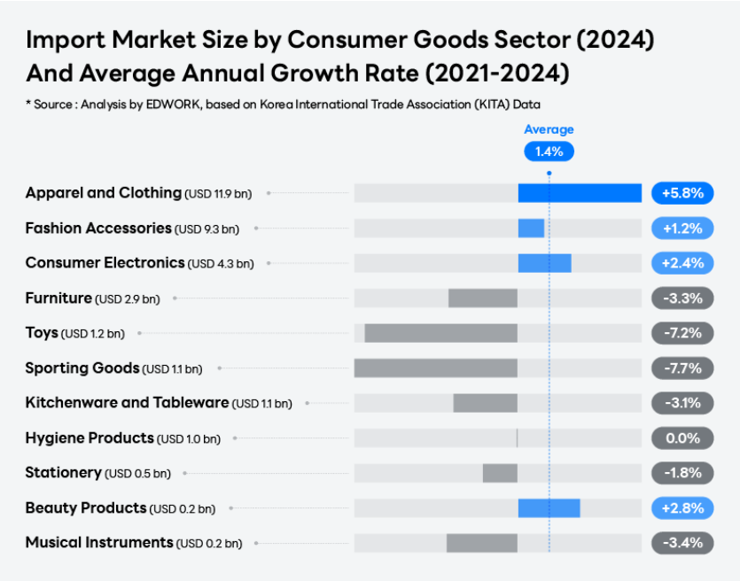 At Deep Dive Korea, we reviewed import growth across 103 categories in 11 consumer sectors, including clothing, footwear, bags, home appliances, furniture, toys, and kitchenware.