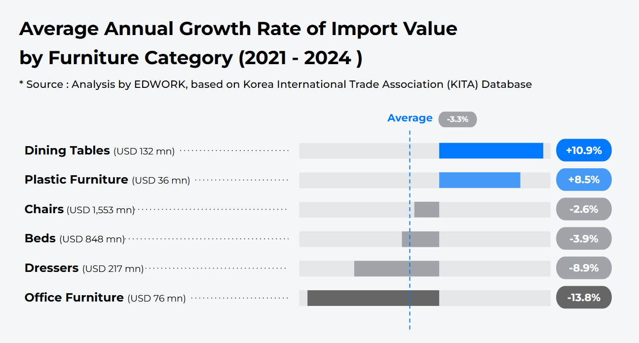 While the overall furniture market is shrinking, only dining tables (+10.9%) and plastic furniture (+8.5%) have shown growth. Although these two categories currently make up just 5.9% of the imported furniture market, their share is steadily increasing.