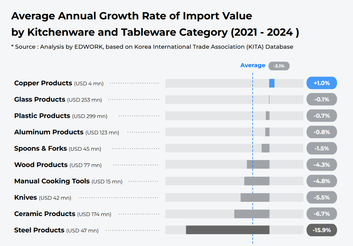 Since 2021, Korea’s kitchenware import market has been steadily shrinking. By material, only copper recorded slight growth (+1.0%). In contrast, glass (-0.1%), plastic (-0.7%), aluminum (-0.8%), wood (-4.3%), ceramic (-6.7%), and steel (-15.9%) all declined. By usage, spoons and forks (-1.5%), manual cooking tools (-4.8%), and knives (-5.5%) also decreased.
