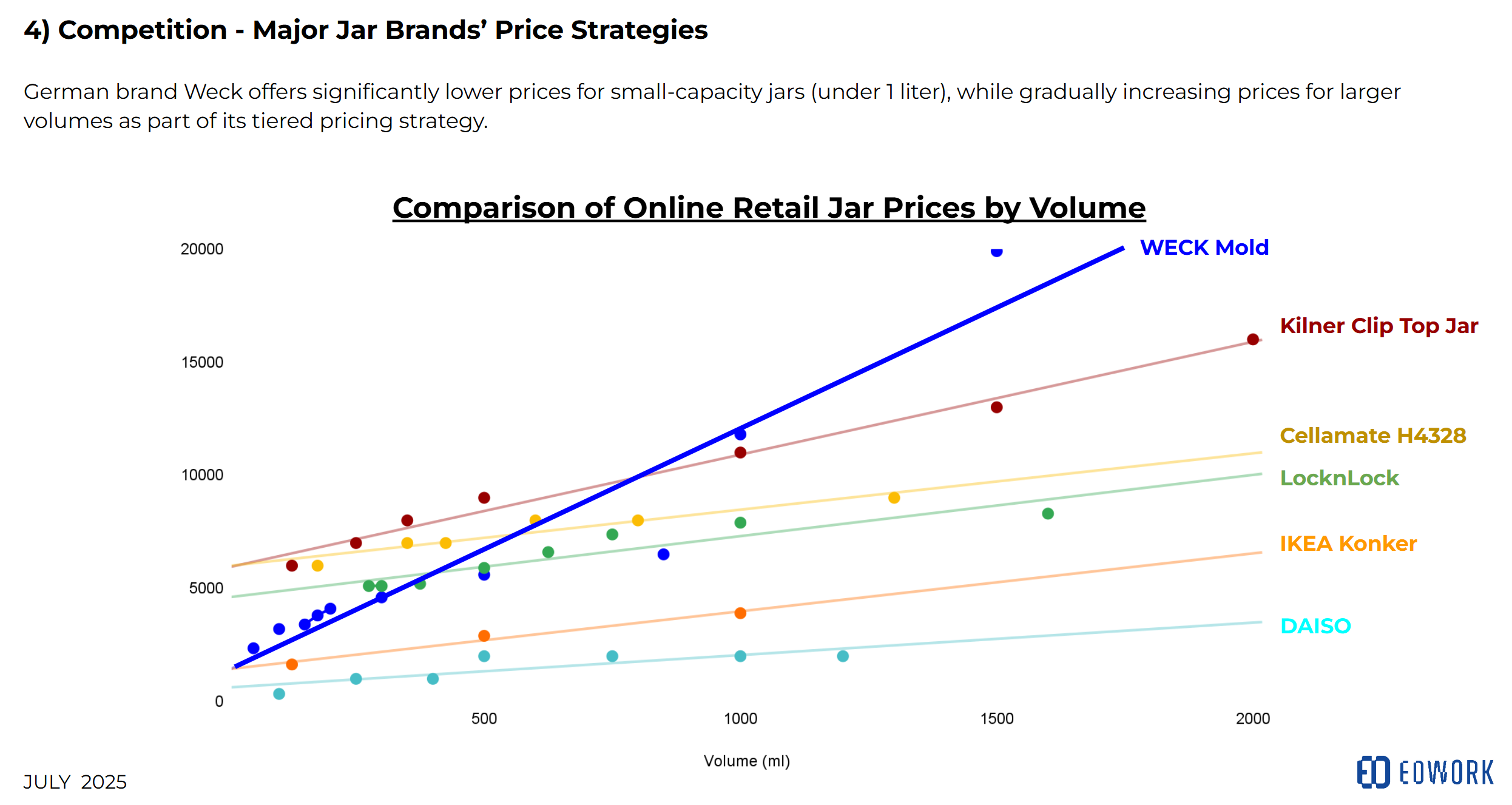 WECK applies a pricing strategy that reflects consumer demand. Small jars (under 500ml), popular with general consumers, are priced lower. Large jars (1,000ml and above), preferred by chefs and businesses, are priced higher. Comparing price curves by size shows WECK’s curve is steeper than competitors’.