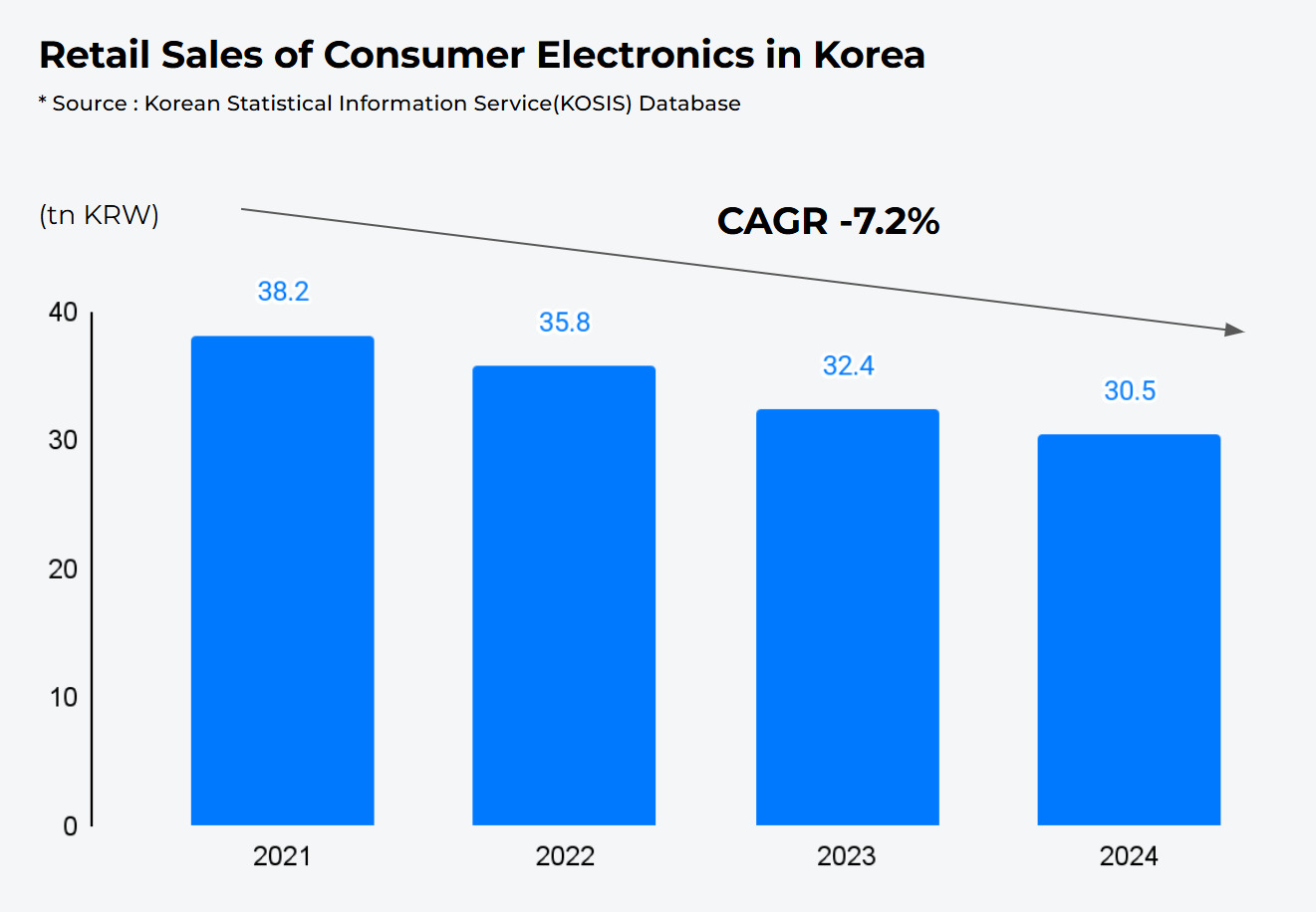 Korea’s consumer electronics market is shrinking fast. It fell from KRW 38.2 trillion (approx. USD 27.4 billion) in 2021 to KRW 30.5 trillion (approx. USD 21.9 billion) in 2024 — a 7.2% annual drop.