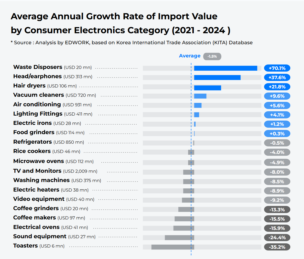 Small and personal devices such as food waste disposers (+70.1%), wireless headsets/earphones (+37.6%), and hair dryers (+21.8%) are growing rapidly. This reflects shifts such as increased awareness of kitchen hygiene, more remote work and streaming service usage, and a preference for premium beauty devices. Robot vacuums and cordless vacuums (+9.6%) are also steadily increasing in imports, supported by rising living standards.